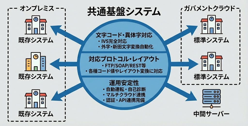 新しい標準準拠システムと、継続利用する既存システムのOS、プロトコル、データ形式の差異を基盤システムが一括吸収します。
