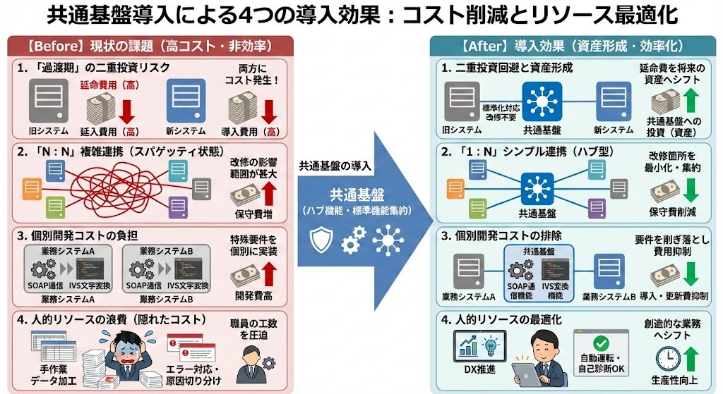 標準仕様への変換を基盤システムが肩代わりし、旧システムへの延命費用(捨て金)を将来も使える「共通基盤」という資産へ変えます。